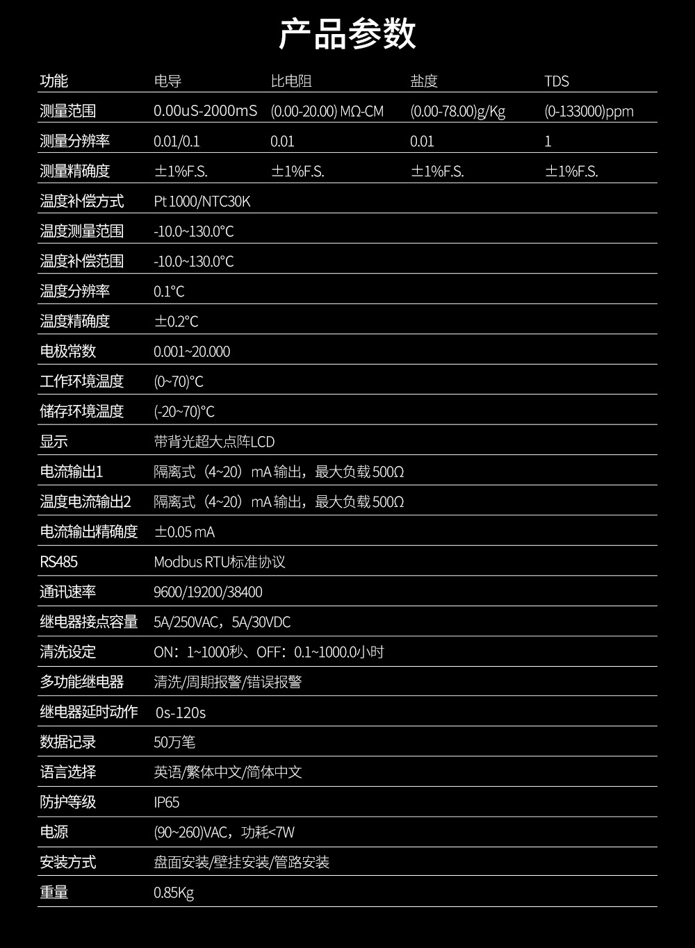 聯測儀表SIN-EC8.0用于工業上電導/比電阻/鹽度/溶解固體總量及溫度的測量,如: 廢水,純凈水,環境監測,食品生產過程等,儀器可以盤面安 裝,壁掛安裝,管路安裝。儀器提供 2 路電流輸出,最大負載為 500Ω, 儀器提供 3 路控制用繼電器,繼電器最大承受電壓及電流為 5A/250VAC 或 5A/30VDC。